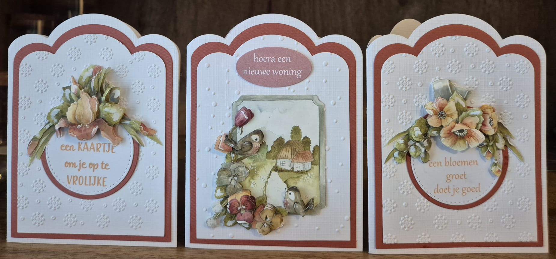 Dit pakket bloemenkaarten bevat al het materiaal voor het maken van deze 3 kaarten