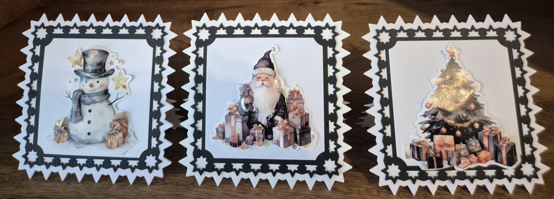 Dit pakket zwart wit kerstman kaarten bevat al het materiaal voor het maken van deze 3 kaarten