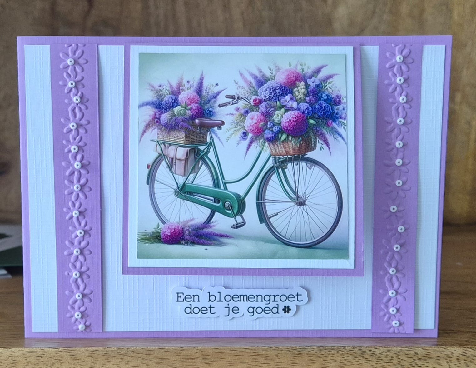 Dit pakket bloemengroet fiets bevat al het materiaal voor het maken van deze kaart,