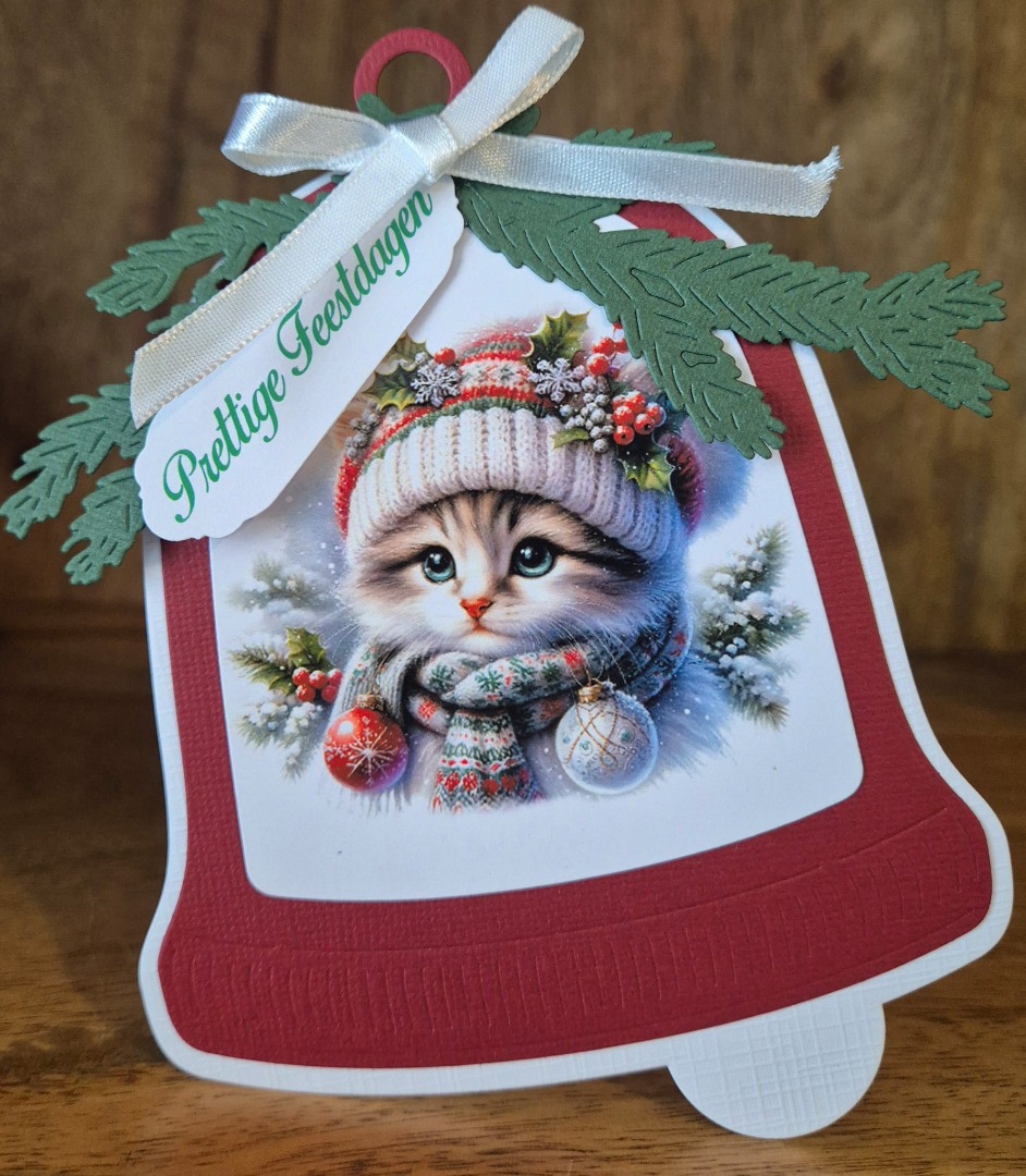 Dit pakket kerstbel met poes bevat al het materiaal voor het maken van deze kaart,