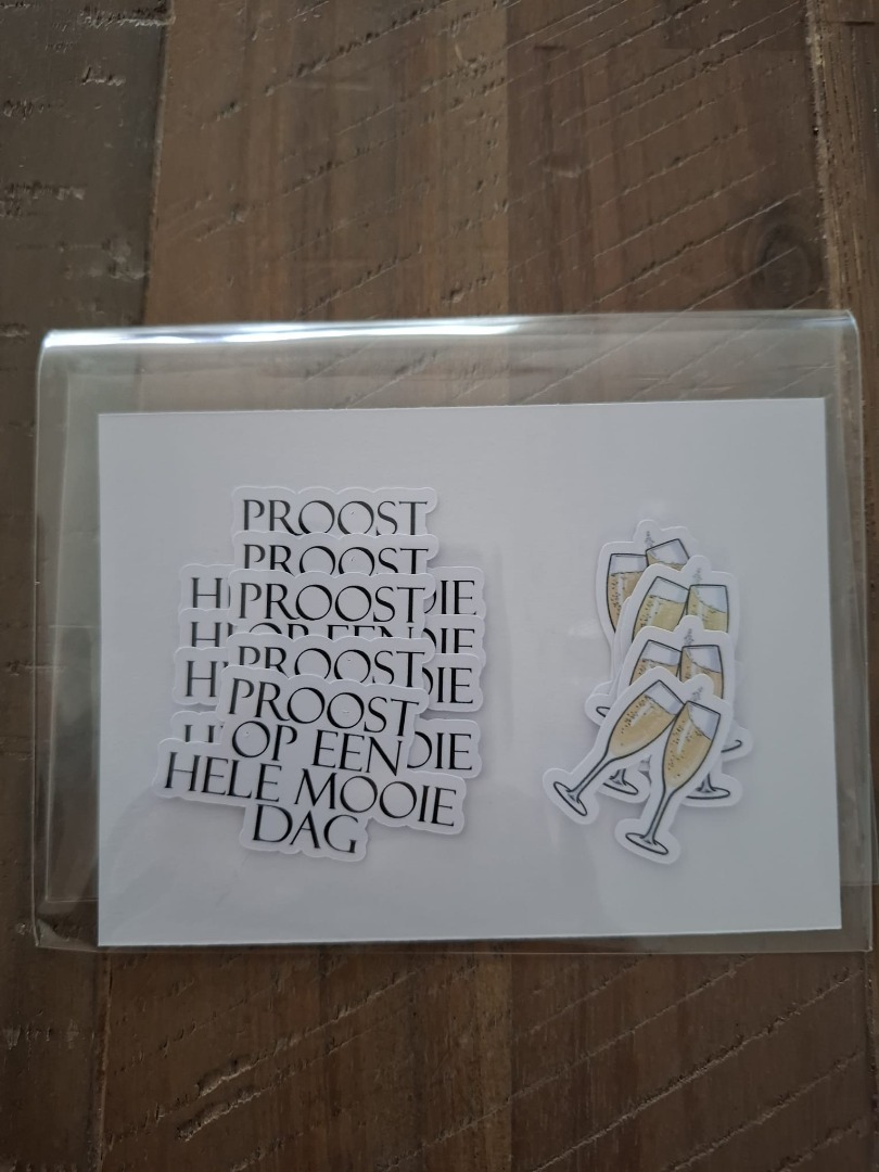 De losse teksten Proost op een mooie dag zijn met zwart bedrukt op 160 grams papier