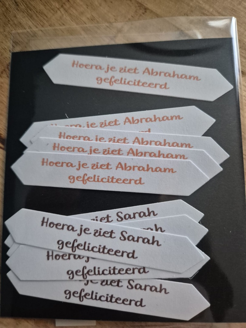 De losse teksten LT Abraham en Sarah zijn met bruin en oranje bedrukt op 160 grams papier
